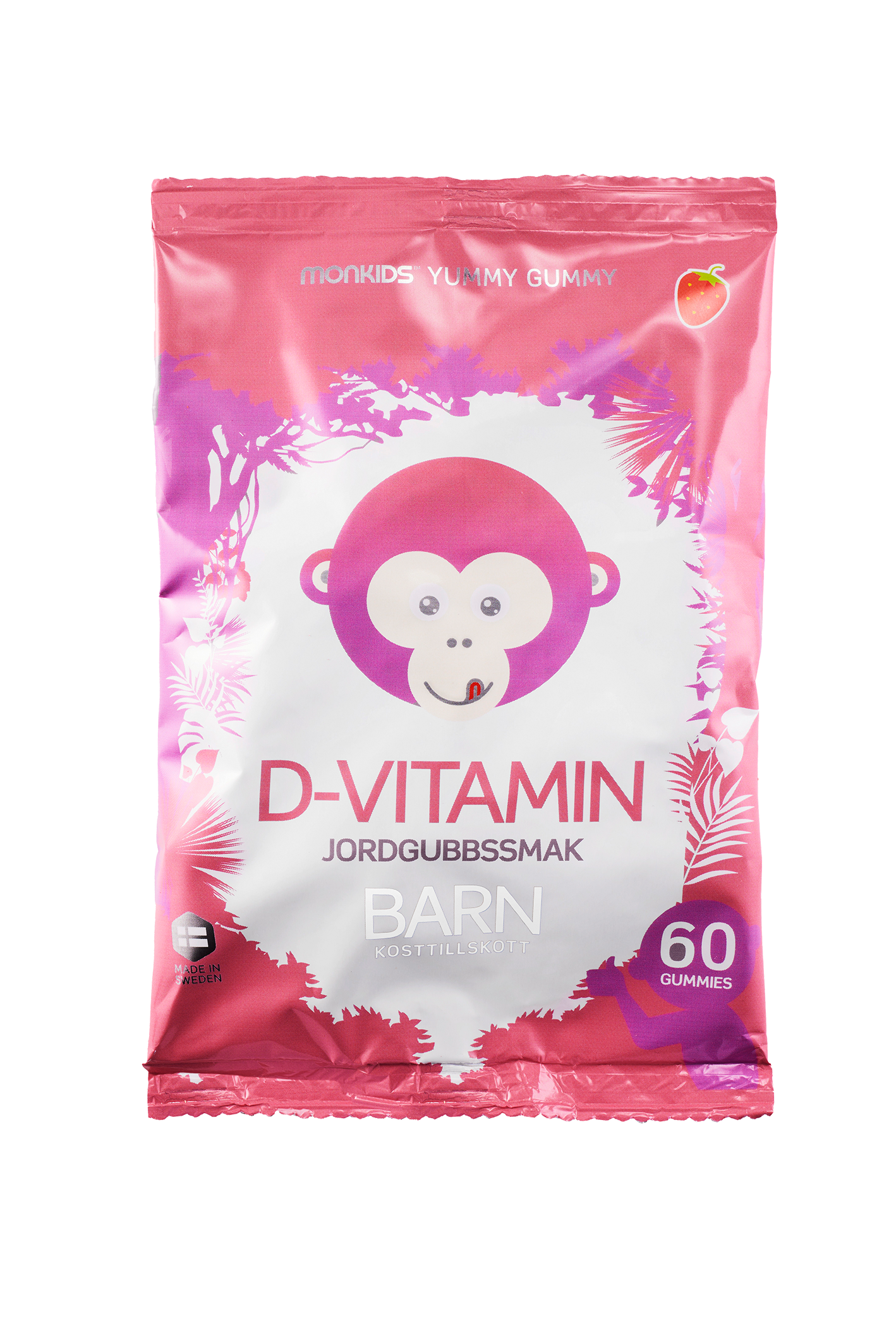 Vill du ge ditt barn extra D-vitamin under vinterhalvåret? Äter ditt barn inte fisk? Säg hej till nya Monkids D-vitamin Jordgubb! En mjuk, god och svensktillverkad gummy full med D-vitamin. En om dagen räcker för att säkerställa hela dagsbehovet av D-vitamin. Produkten är vegansk och har naturlig jordgubbssmak. Den fina fägen kommer från blåbär och morot. Passar hela familjen