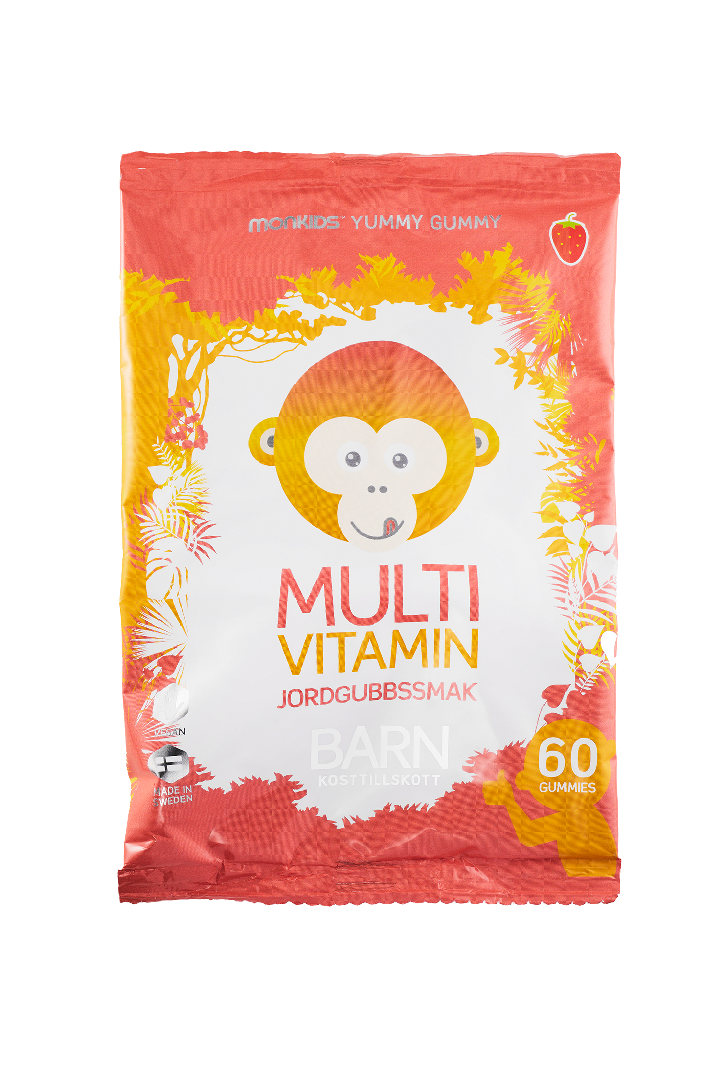 Monkids Multivitamin Jordgubb är mjuka vitamin-gummies i form av små apor med naturligt god smak av jordgubb. Monkids Multivitamin Jordgubb är kosttillskott anpassad till barn från 3 år. Gummyn är vegansk och helt fri från gelatin (Vitamin D3 utvinns från alg och lav).